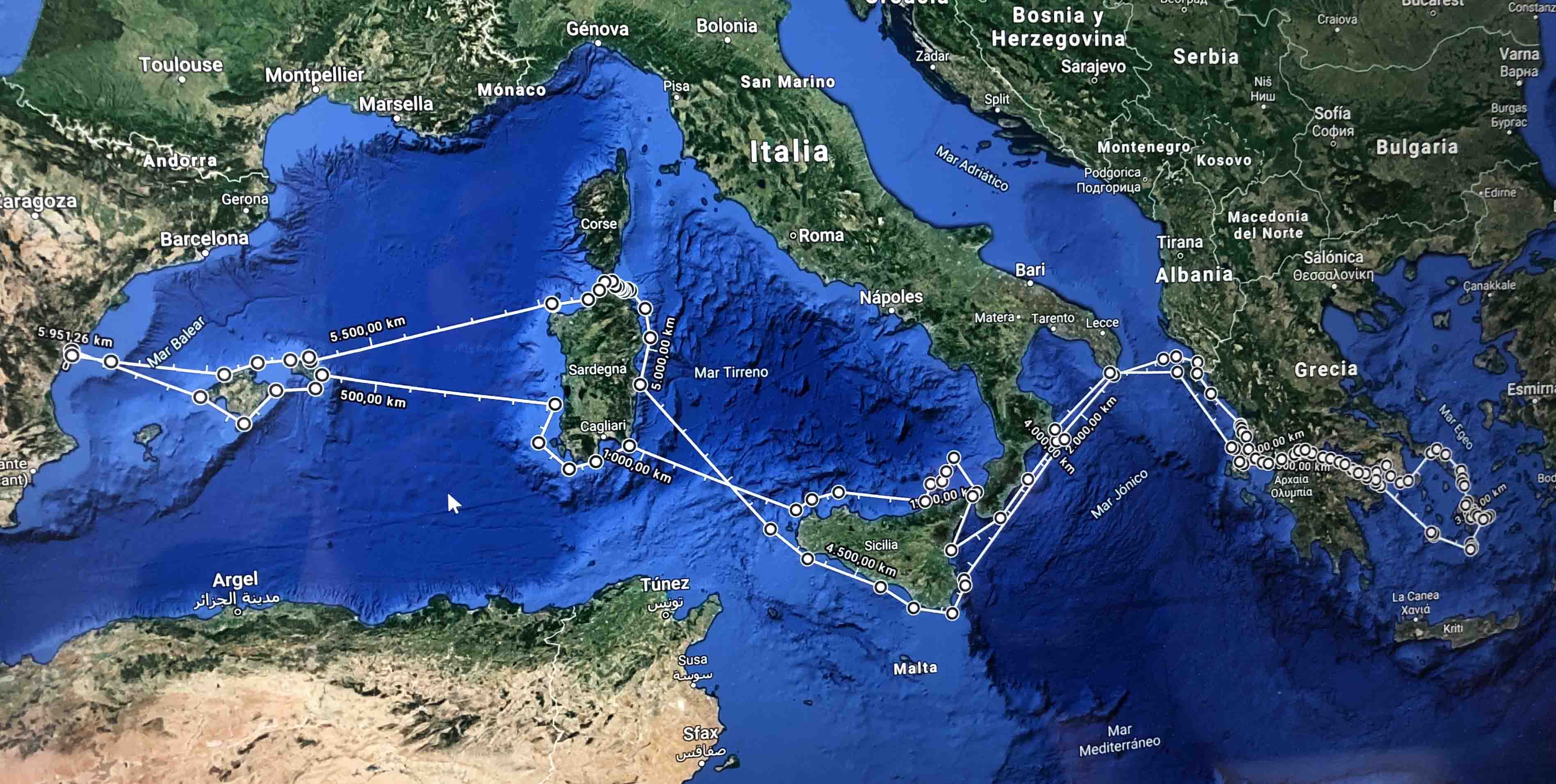 Una aventura de 3500 millas naúticas recorriendo las Islas Baleares, Mallorca y Menorca, Oeste y Sur de Cerdeña, Norte de Sicilia e Islas Eolias, paso por el Estrecho de Messina, costa Sur de Italia y llegada a las Islas Jónicas en el mar Jónico, paso por el canal de Corinto al Mar Egeo, parada en Atenas y recorrido por las Islas Cicladas para volver por Corfú en las Islas Jónicas, Sur de Italia a Siracusa en Sicilia, Sur de Sicilia, y luego remontar la costa Este de Cerdeña para visitar el archipiélago de la Magdalena y entrar por las bocas de Bonifacio para cruzar a Cala Fornells, recorrer norte de Menorca y de ahí a Cabo Formentor en Mallorca y costa Oeste de Mallorca hasta llegar finalmente a Burriana.