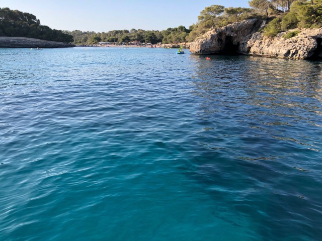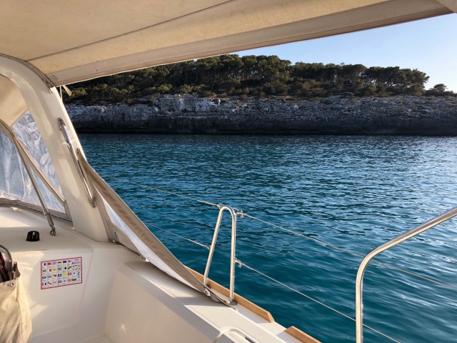 Y después de unas 15 millas hemos llegado a Cala Mondragó en Mallorca desde donde partiremos a Cerdeña a primera hora. Esta es una Cala preciosa con cuatro brazos, y en la que comparto Cala con otro velero Alemán y un catamarán.