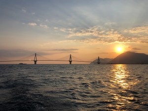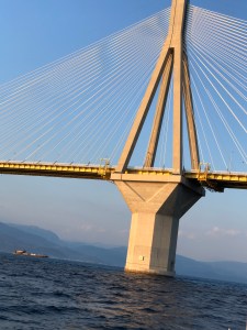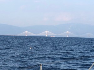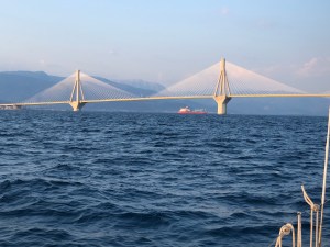 Hemos cruzado el mayor puente del mundo tipo colgante. Une Mainland Grecia y el Peloponeso por Rion. Una magnífica obra de arquitectura que hay que pedir permiso para pasarla. Al ir hacia el Este tenemos que dejar tres pilares a la izquierda y uno a la derecha. La altura libre por el lado que pasamos es de 25m aunque la sensación de que vas a dar está siempre presente. Nuestra altura con mástil es de unos 18 metros.