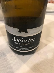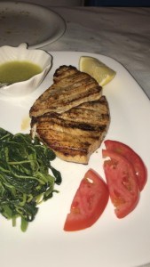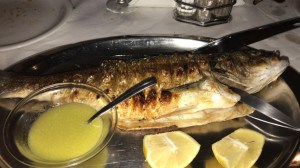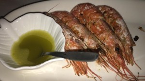 Gambas, pulpo, sardinas, lubina y pez espada con vino blanco griego.